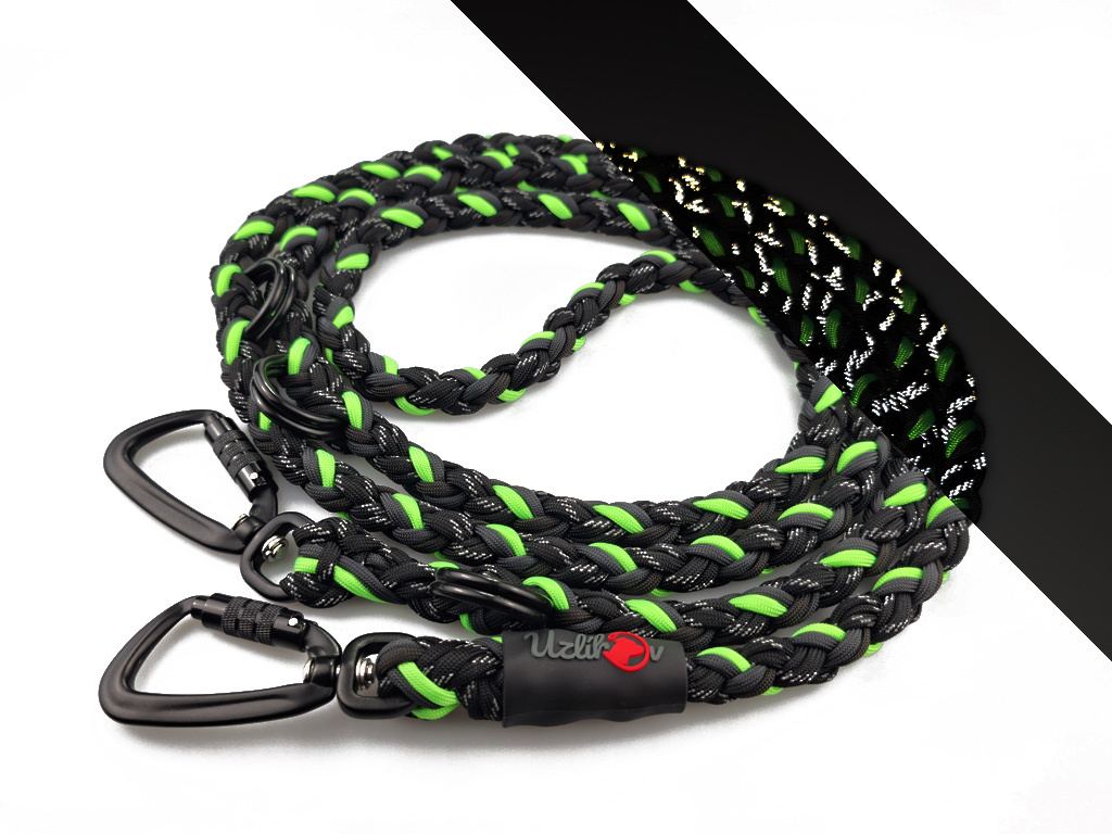 Vodítko paracord 220 cm přepínací TWIST NEON BLACK zelené pro psy do cca 50 kg | duralové twist-lock černé karabiny